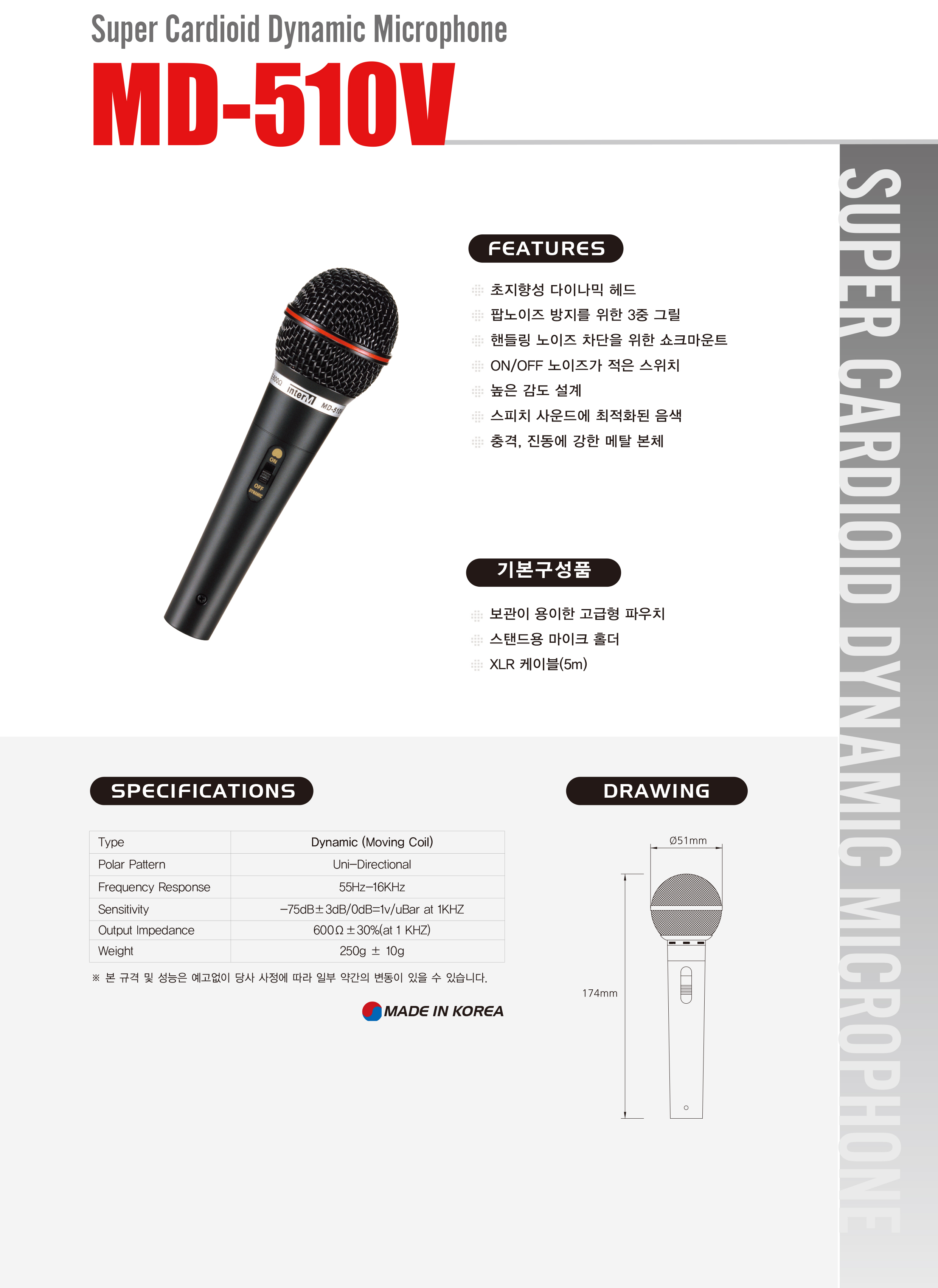 - 중 저음 특성을 보강하여 노래방, KARAOKE 등 전문 VOCAL에 용이하며 내구성이 강하다.