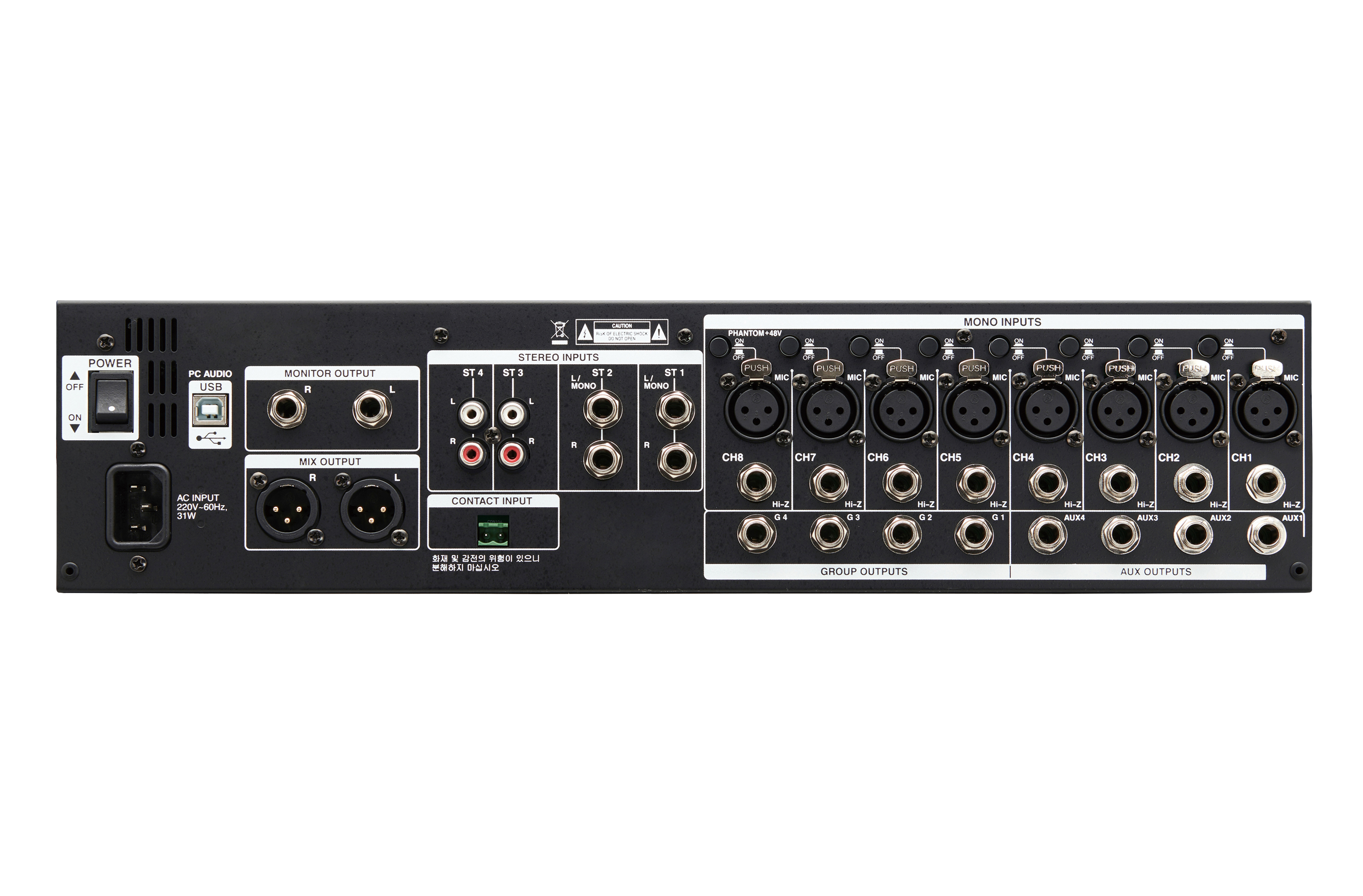 간편하게 사용할 수 있는 고음질의 EQ를 통해 따뜻하고 풍부한 사운드를 표현합니다. 또한 비상방송설비의 화재안전기준 제4조 제8호에 맞는 비상용 접점 신호 수신 기능을 구현하였으며, 아날로그 PC 오디오 신호의 잡음을 해결하기 위한 USB포트를 적용하였습니다. 아날로그 믹서이지만 디지털 음원의 재생(mp3, wav)과 녹음(wav)을 할 수 있는 다목적 기능의 믹서로 소중규모 교회부터 학교 방송실, 강당 및 소형 이벤트 렌탈에 적합하게 사용할 수 있습니다.